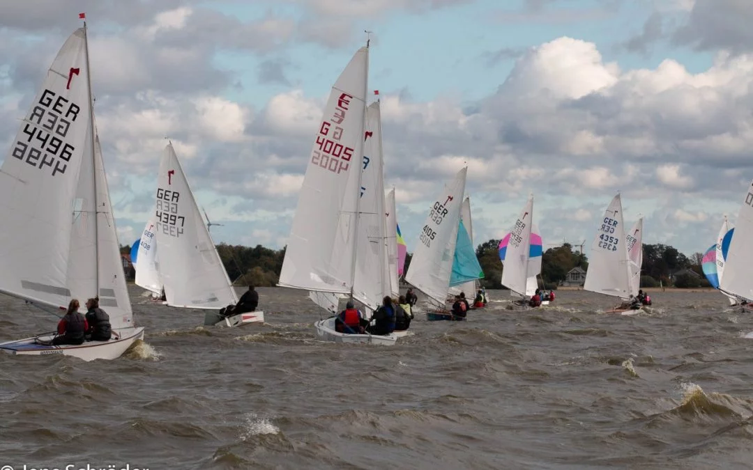 Endlich – nach zwei Jahren, wo der Dümmer nicht genügend Wasser geführt hat, konnte dieses Jahr das Dümmerfinale wieder stattfinden. Entsprechend viele Teams (37) hatten auch gemeldet inkl. vieler Jugendteams, die die Regatta als letzte Vorbereitung vor der IDJM zu nutzen wussten. Parallel zum Dümmerfinale waren die Conger schon drei Tage zu Gast beim SVH und segelten ihren Deutschen Meister aus. Da wir am Samstag erst um 13:00 Uhr unseren ersten Start hatten, waren die Conger, die schon um 10:00 Uhr gestartet sind so gut wie durch mit ihren drei Tagesrennen, wodurch wir den Kurs fast für uns alleine hatten. Pünktlich wurde gestartet und in der ersten Wettfahrt hatten wir mit Abstand den meisten Wind des Tages mit gut 3-4 Beaufort, der dann bis 17:00 Uhr konstant abnahm und am Ende musste sogar in den Hafen gepaddelt werden. Im ersten Rennen ging es vorne sehr eng und knapp zu und gerade Kai/Pascal konnten mit ihrem super schnellen Spi die Führenden ziemlich ärgern und wurden am Ende auch Zweite ganz knapp hinter Frieder/Julius und knapp vor Svenja/Butze und uns beiden. Im zweiten Rennen wurde der Wind langsam weniger und der angekündigte lange Rechtsdreher setzte sich durch, wodurch Jens/Lollek die Führung an der Luvtonne übernahmen, diese aber leider nicht bis ins Ziel halten konnten. Svenja/Butze konnten sich am Ende das zweite Rennen sichern vor Tobias/Nick und Martin und mir. Im dritten Lauf waren am Start vielleicht nur noch 5-7 Knoten und diese nahmen im Laufe des ersten Dreiecks weiter ab, sodass die Wettfahrtleitung entschied uns nach der zweiten Kreuz schon ins Ziel fahren zu lassen. Wie so oft war unter Land noch ein bisschen mehr Wind und weiter draußen auf dem See wurde es immer weniger. Somit war die linke Seite wieder bevorteilt, obwohl die rechte Seite den besseren Dreher hatte. Am Ende setzten sich Sebastian/Ralph vor Finn/Timon und Svenja/Butze durch. Die Wettfahrtleitung zeigte an diesem Tag eine super starke Leistung; die Tonnen und auch die Länge der Schenkel wurden regelmäßig und aktiv angepasst, sodass der Kurs immer perfekt lag. Sowas erlebt man leider nicht mehr oft und sollte eigentlich bei jeder Regatta Standard sein. Nach dem ersten Tag führten Svenja/Butze deutlich vor uns beiden und wir lagen 1 Punkt vor Frieder und Julius.