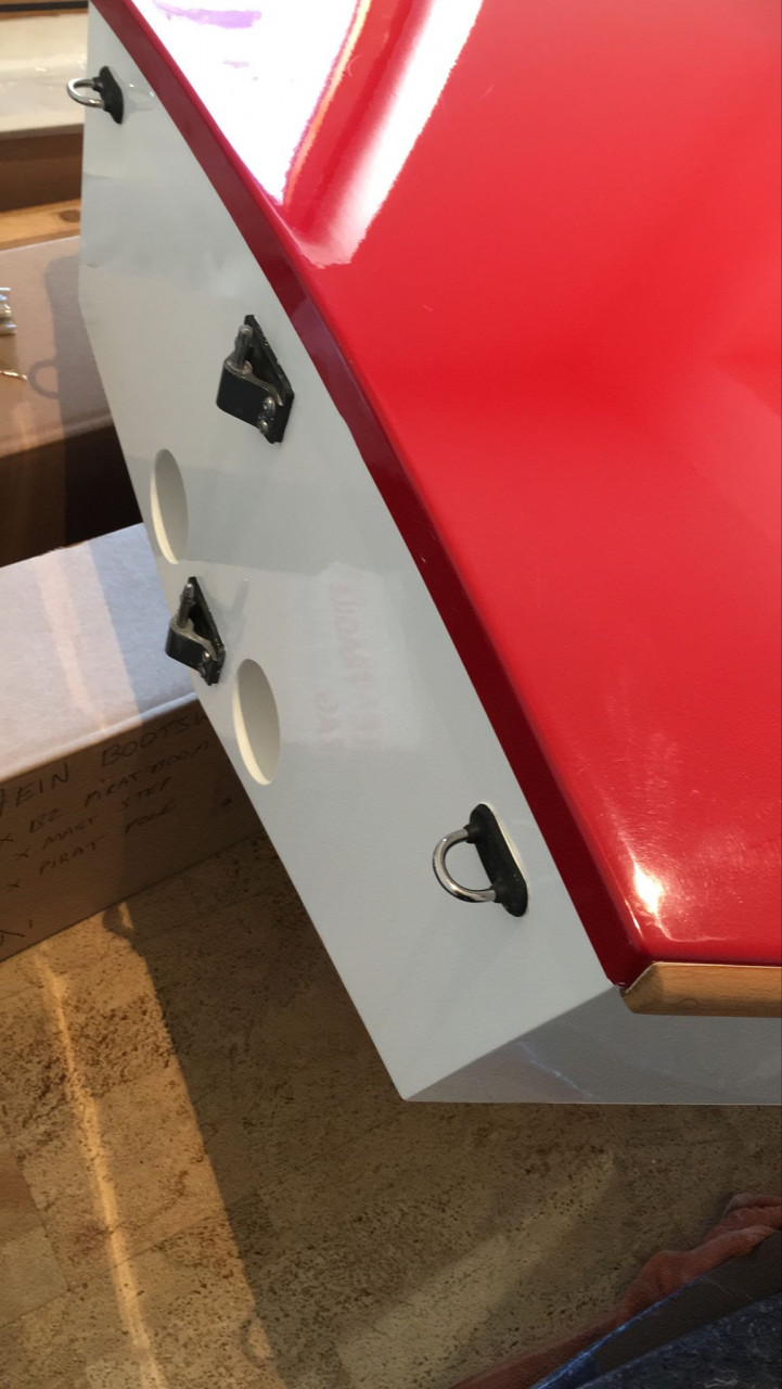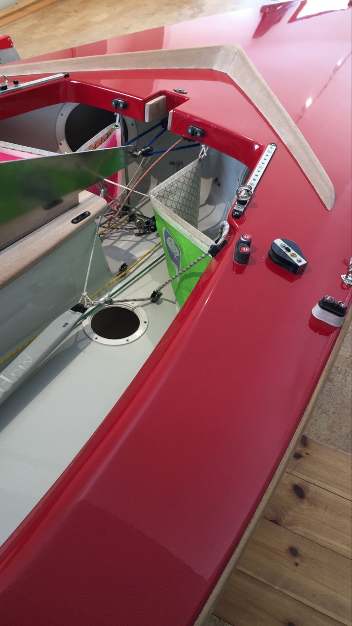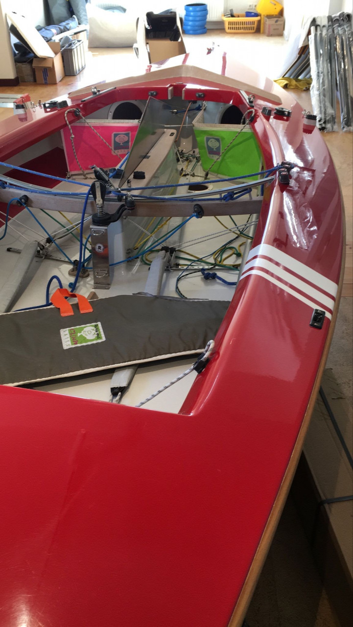 Decksfarbe rot mit weißen Streifen, Rumpfarbe weiß