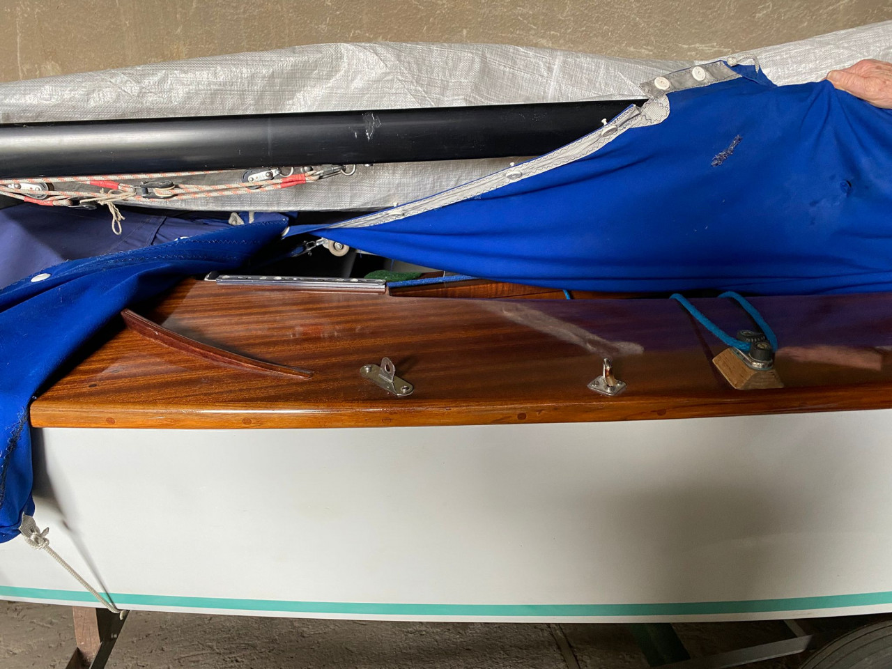Ausstattung: Satz Segel (Großsegel von 2002), Clown Sails Persenning (2012), Harbeck-Trailer, Slipwagen